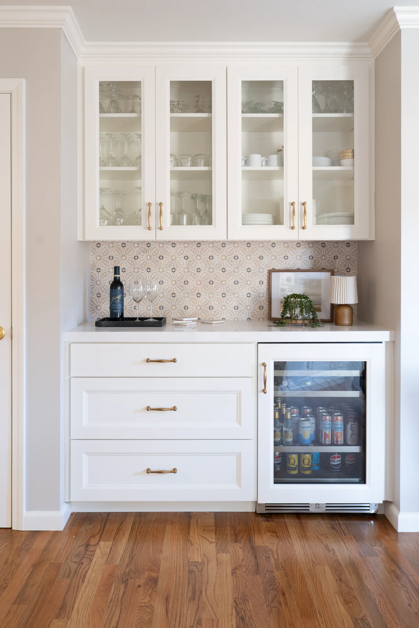 From there, finish selections were made thoughtfully but at a more moderate level throughout. Semi-custom cabinetry replaced fully custom. Built-in appliances were specified rather than Sub-Zero or Wolf. Countertops were quartz and granite rather than quartzite or marble. Backsplash tile ran approximately $5 per square foot rather than a specialty material. Plumbing fixtures and lighting were carefully chosen, but not at a premium tier.